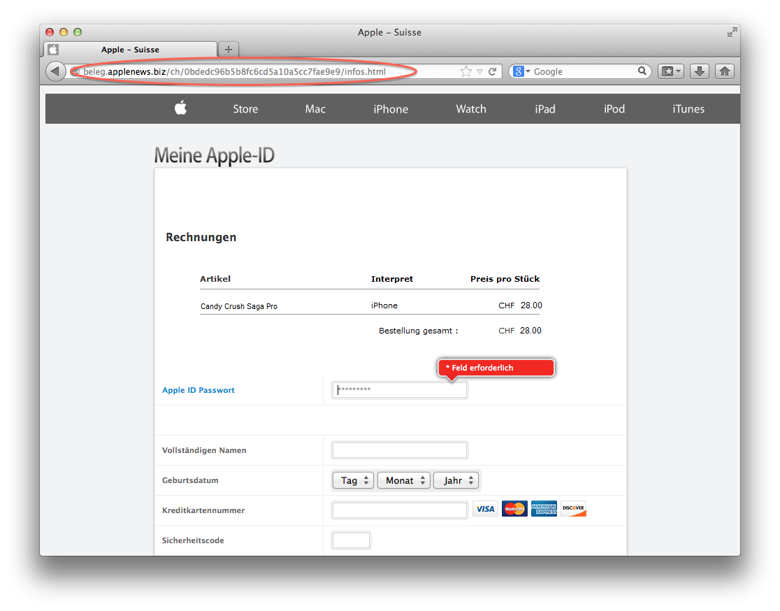 Durch zwei weitere klicks gelangt man auf eine Seite die difinitiv nur da ist, Daten zu klauen. Mann kann sie leicht erkennen da die Adresse nicht von apple.com ist.